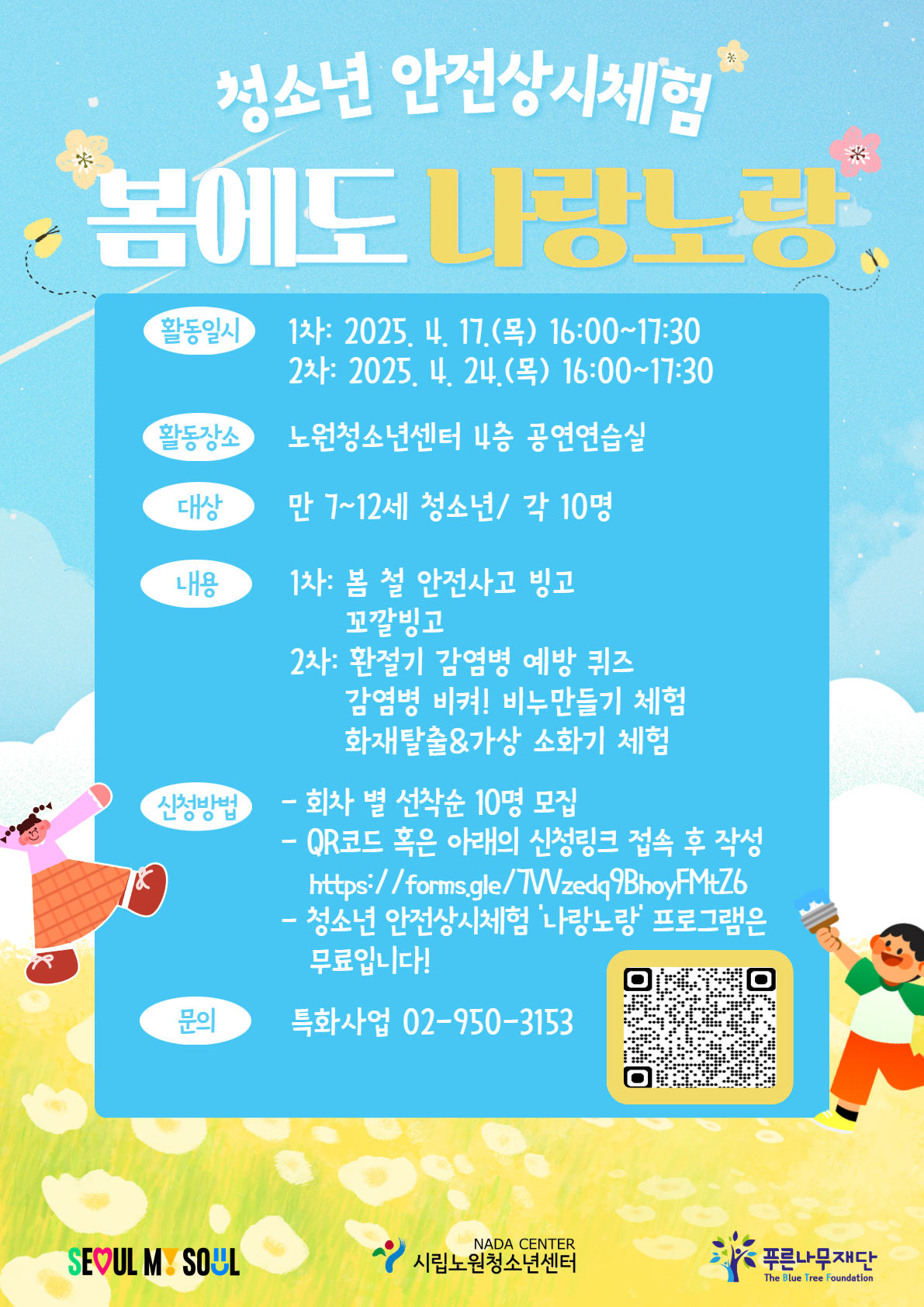 안녕하세요 노원청소년센터 특화사업팀입니다! 따뜻한 봄을 맞이해 2025년 4월 안전상시체험 '나랑노랑'이 돌아왔습니다!
