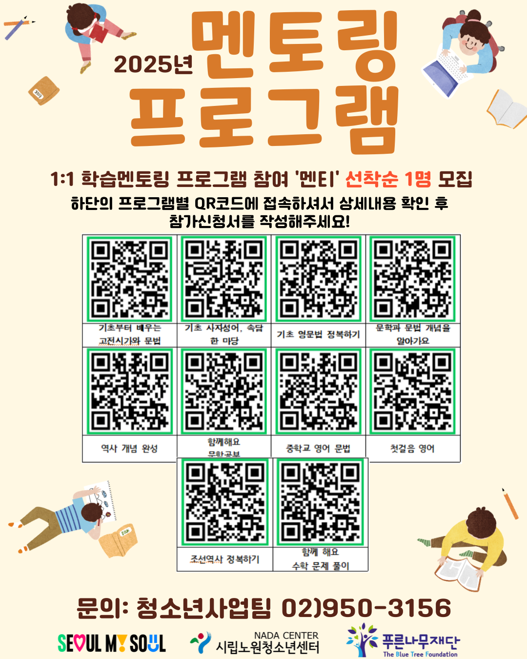 2025년 1:1 학습 멘토링 프로그램 참여 ‘멘티’를 선착순 1명 모집하오니 관심있으신 분들께서는 하단의 포스터를 참고하시어 신청 부탁드립니다.