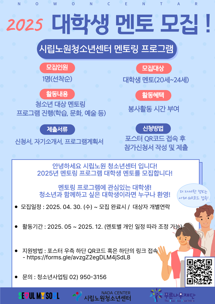 내 용: 2025년 대학생 멘토 모집(프로그램 진행-학습, 문화, 예술 등 멘토링 진행할 수 있는 분야 중 자유롭게 진행 가능.)