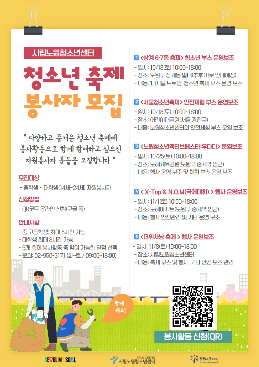 ๐์ ์ฒญ๋งํฌ: ์ฒญ์๋ ์ถ์ ๋ด์ฌํ๋ ์ ์ฒญ๐๋ด์ฌํ๋ ์ ์ฒญ ์, '๋๋ณผ'ํน์ '1365' ๋ด์ฌํ๋ ํํ์ด์ง ๊ณ์ ์์ด๋๊ฐ ํ์ํฉ๋๋ค.๐์ค๊ณ ๋ฑํ์์ ๊ฒฝ์ฐ ์ต๋ 6์๊ฐ, ๋ํ์์ ๊ฒฝ์ฐ ์ต๋ 8์๊ฐ ๋ด์ฌํ๋ ์ฐธ์ฌ ๊ฐ๋ฅํฉ๋๋ค.๐๋ด์ฌ์๊ฐ ์ธ์ ์ ์ค์ ํ๋ํ๋ ๋ด์ฌ ์๊ฐ์ผ๋ก ์ธ์ ๋ฉ๋๋ค.๐๋ฌธ์: 02-950-3171 (ํ~ํ / 09:00~18:00)
