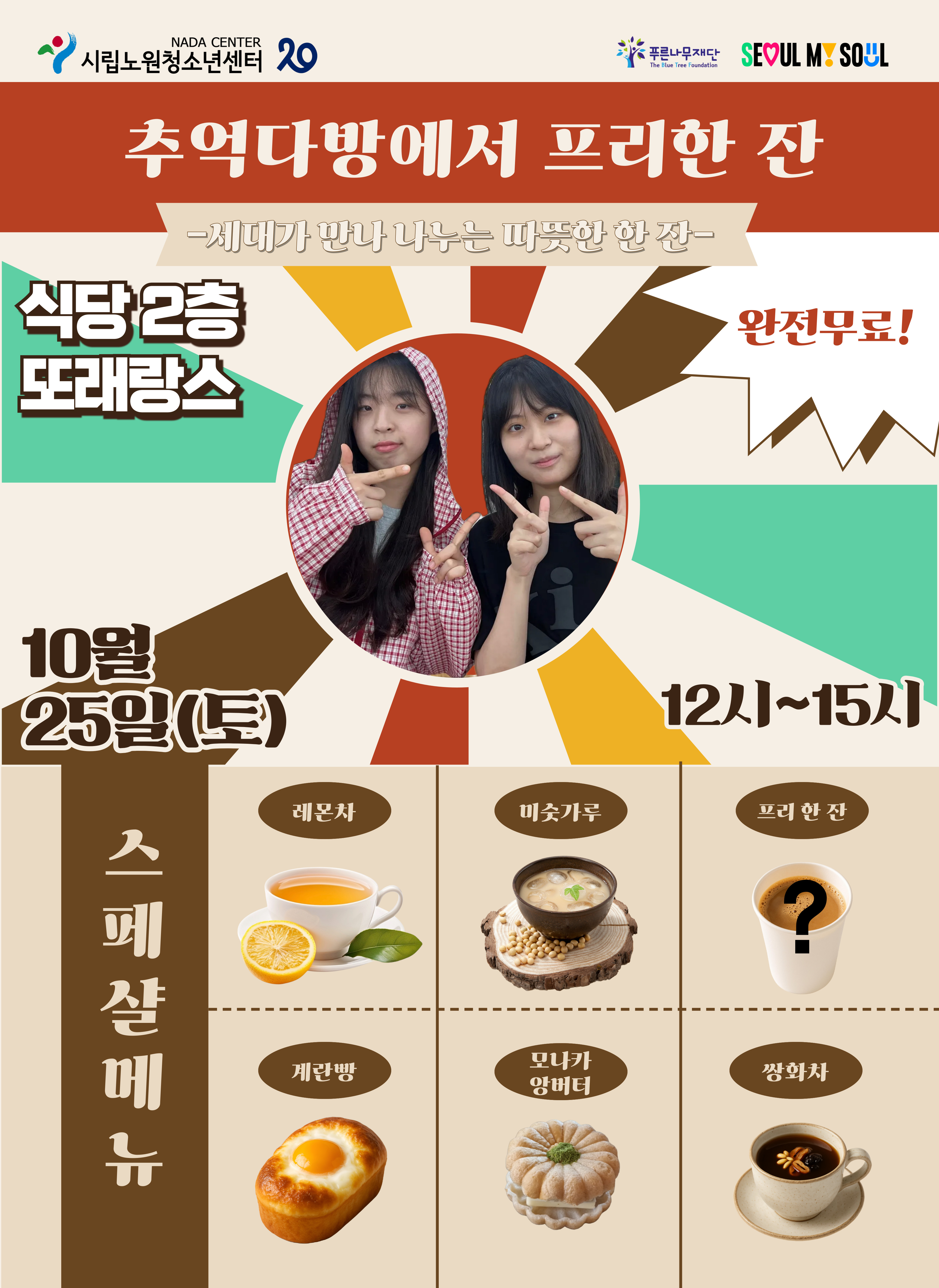 ⭐10월 25일 토요일 12~15시 노원청소년센터 또래랑스에서⭐ 선착순 무료로 음료(레몬차/미숫가루/쌍화차/프리한잔)과 다과(계란빵/모나카 앙버터)를 제공할 예정이니 부담 없이 오셔서 세대간의 이해와 공감을 넓히는 일에 동참하여 지역의 온기를 나누어주시길 바랍니다!