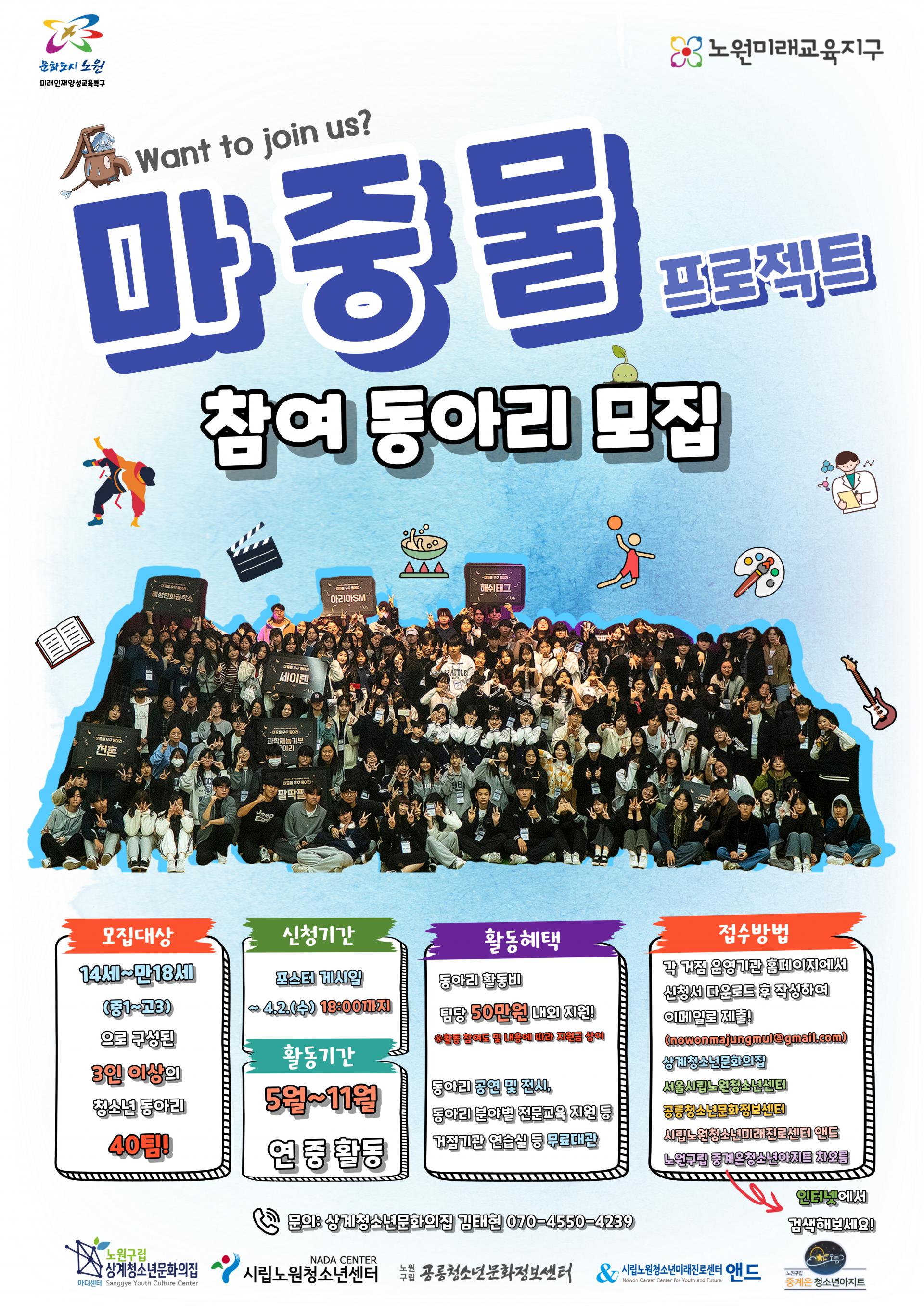 노원구의 끼와 재능이 넘치는 청소년 여러분을 위한 특별한 기회! 노원청소년센터에서 마중물 청소년동아리를 모집합니다.